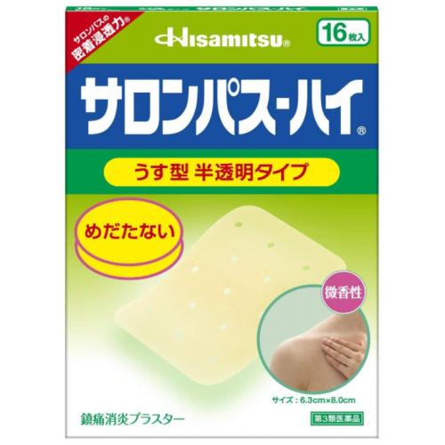 반투명 필름을 사용한 파스. 무취성 살리실산 글리콜을 사용하여 외출시에도 안심하고 사용가능