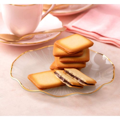 사쿠와 얇게 구운 바닐라 맛의 랭그샤쿠키로 매끄러운 스위트 초콜릿 크림을 샌드했습니다